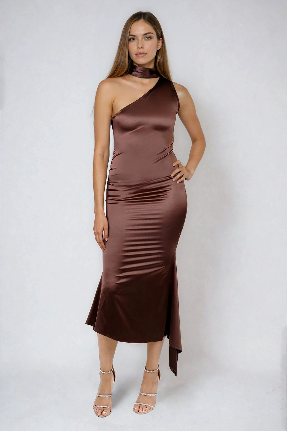 All Eyes Here One Shoulder Satin Midi Dress - Coffee