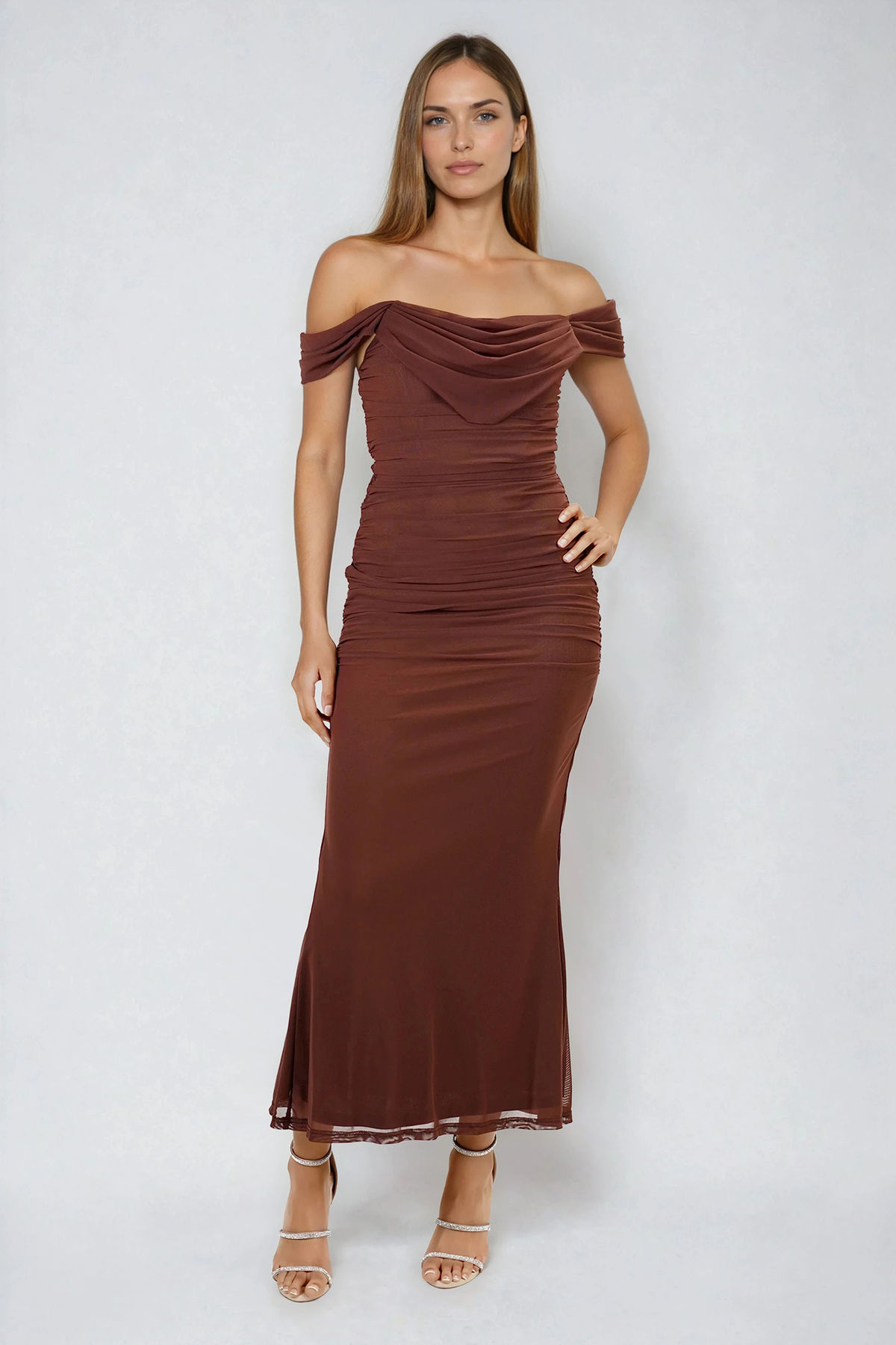 Pure glamour with a curve-loving fit, the Catch the Glow Off Shoulder Bodycon Maxi Dress in Brown features a softly draped off-the-shoulder neckline, ruched bodycon silhouette, and smooth stretch fabric that hugs in all the right places while staying comfortable. The elegant length and sculpting design make it effortlessly flattering. Perfect for weddings, formal events, cocktail parties, date nights, and special occasions.