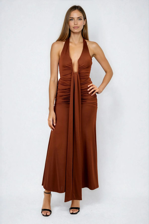 Bold, sultry, and impossible to ignore, the Own the Night Plunge Bodycon Maxi Dress in Brown features a dramatic plunging neckline, figure-enhancing ruching, and a fluid draped detail that elongates the silhouette. Designed with a body-hugging fit and soft stretch fabric, it delivers confidence and comfort with statement-making appeal. Perfect for formal events, destination weddings, upscale vacations, cocktail parties, and nights out.