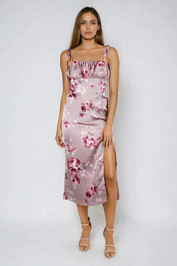 Flirty, feminine, and made to turn heads, the Fresh Start Floral Satin Midi Dress in Mauve Floral stuns with a romantic floral design, delicate strap details, and a flattering neckline. The smooth fabric skims the body just right, while the leg-baring slit and open-back moment add instant drama from every angle. Easy to style and impossible to ignore, it’s perfect for date nights, garden parties, weddings, brunch events, and warm-weather celebrations.