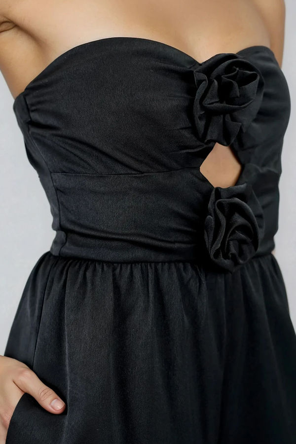The Strike a Pose Cutout Satin Jumpsuit in Black brings effortless drama with a smooth solid pattern that keeps the look sleek while letting the details do the talking. Designed with a sculpted bodice, flirty rosette accents, and a subtle front cutout, it flatters up top and flows into relaxed wide legs for easy movement. Polished yet playful, it’s perfect for date nights, cocktail parties, weddings, vacation dinners, or any moment you want to feel confident.