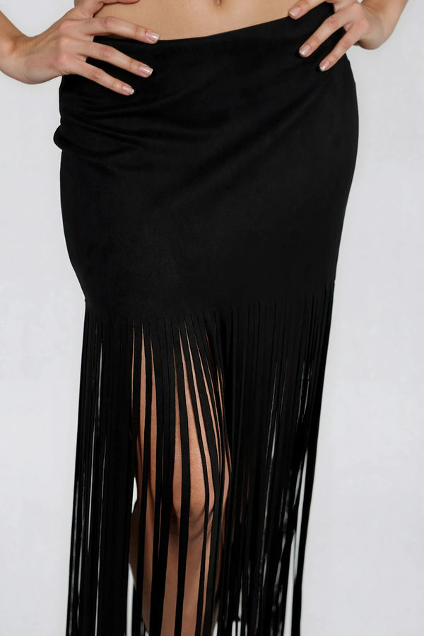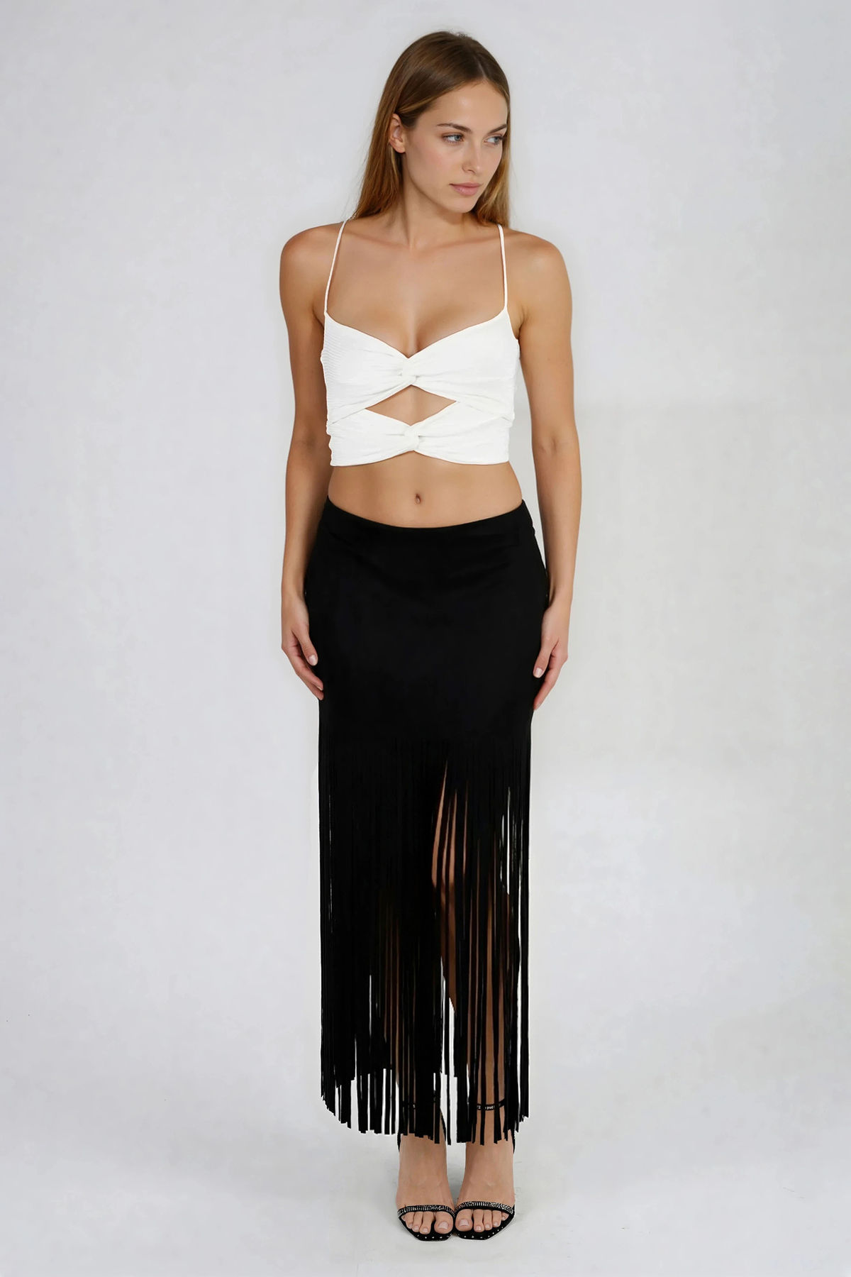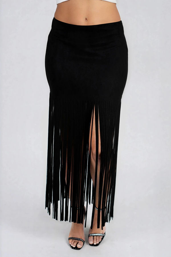 Bold, dramatic, and made to move, the Night Affair Fringe Maxi Skirt in Black brings instant after-dark energy to any look. Designed with a sleek high-waist fit, flowing fringe detail, and a sultry side slit, it creates stunning movement with every step while elongating your silhouette. Statement-making yet easy to style, it’s perfect for nights out, parties, date nights, concerts, bachelorette events, or any occasion where turning heads is part of the plan.