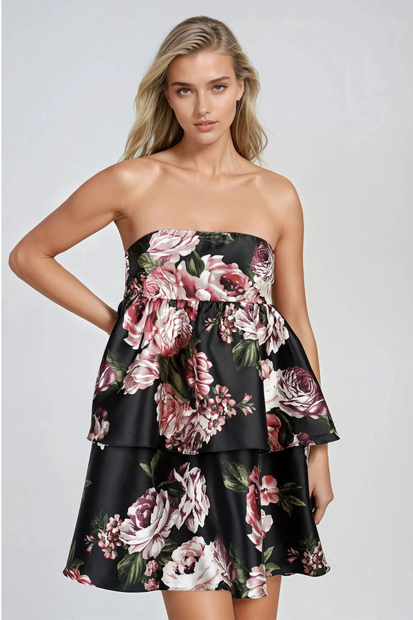 Bold and romantic, the Spellbound Glow Strapless Floral Mini Dress in Black Pink is made to steal the spotlight. This strapless mini features a sweetheart neckline, tiered skirt, and a soft satin finish that gives every step a little drama. Flowy yet structured, it flatters your shape while keeping things fun and flirty. Perfect for cocktail parties, weddings, birthday dinners, and holiday events—just add heels and you’re ready to shine.