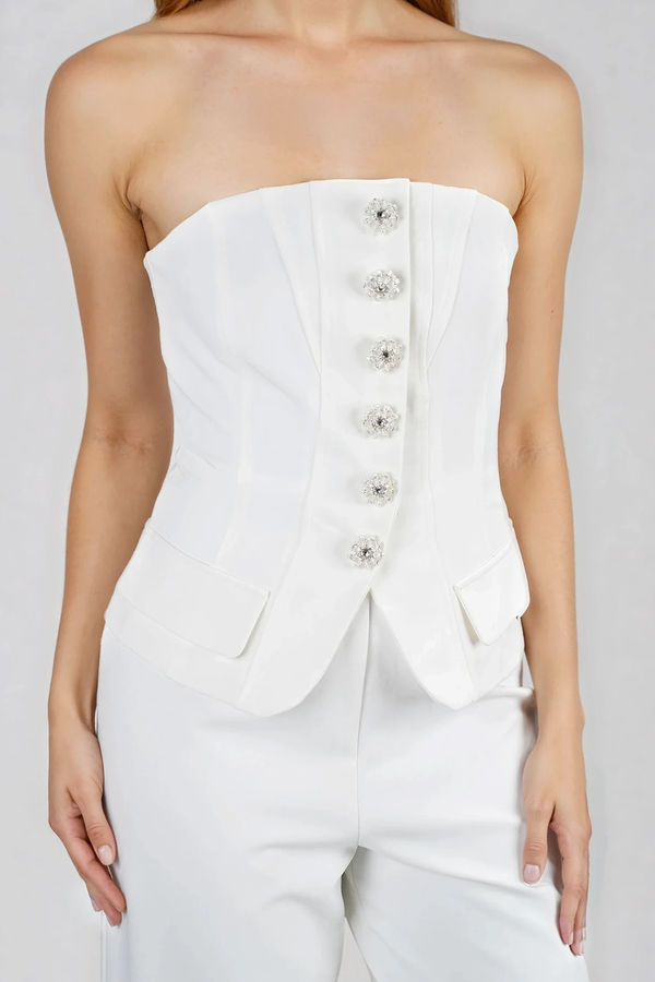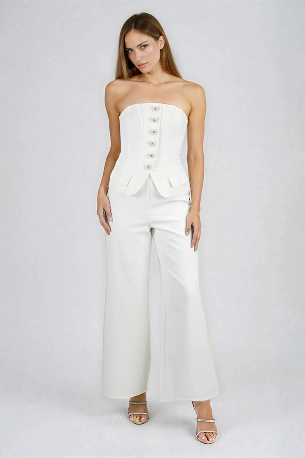Sleek, confident energy defines this Light & Breezy Strapless Jumpsuit in Off White with its sculpted corset bodice, statement buttons, and flowy wide-leg fit that moves with you. Designed to flatter and stay in place, it hugs your waist while giving effortless comfort from day to night. Perfect for weddings, brunch celebrations, rooftop parties, or dressy vacations when you want to look polished, powerful, and totally unforgettable.