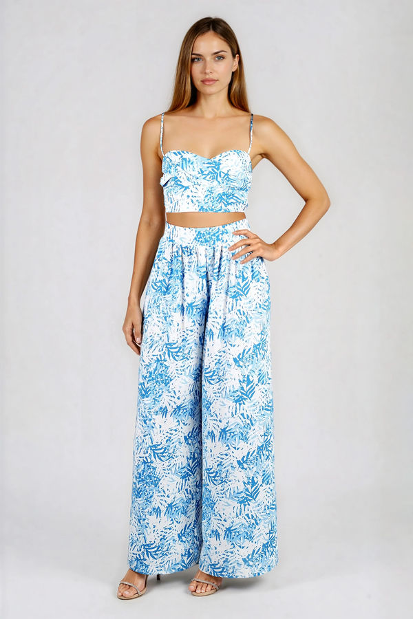 Playful, polished Pack Light Print Smocked Cropped Top & Pants Set in Blue brings effortless style to sunny days and carefree plans. Designed with a flattering smocked crop top and flowy wide-leg pants, this matching set delivers comfort without sacrificing impact. Perfect for vacations, brunch dates, resort wear, or casual outdoor events when you want to look put-together with zero effort.